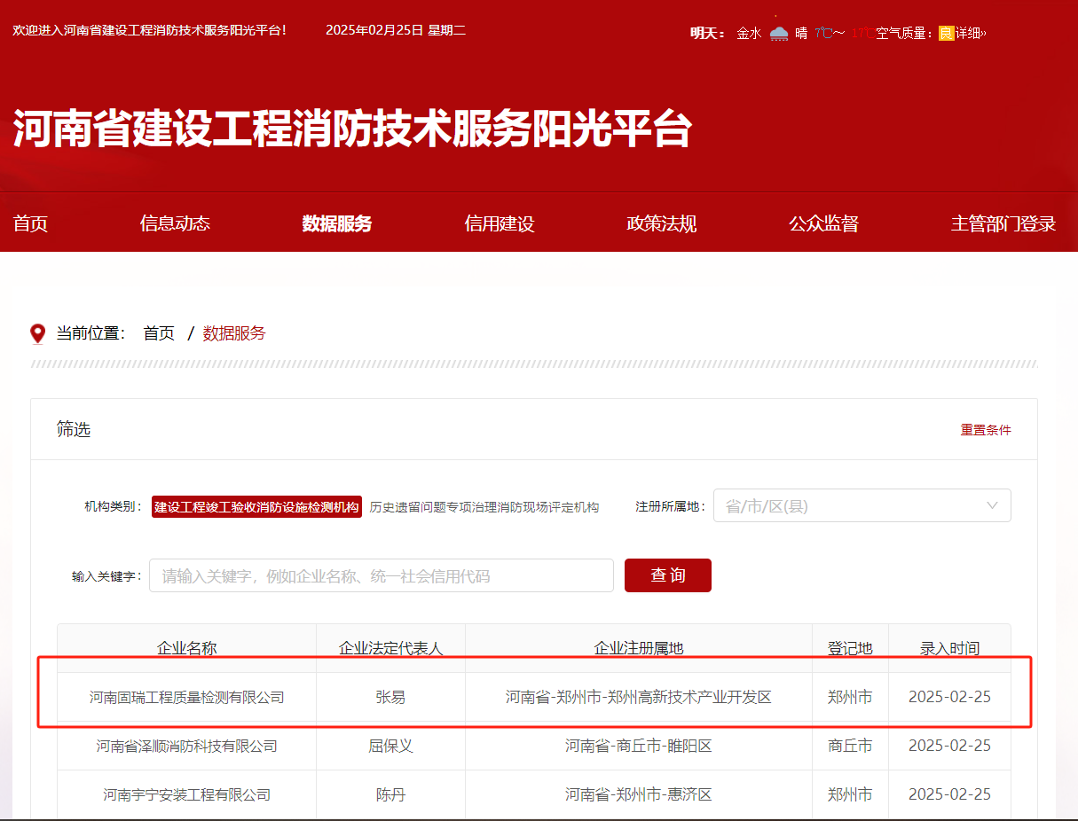熱烈祝賀河南固瑞工程質量檢測有限公司入冊河南省建設工程消防技術服務陽光平臺!?。?
